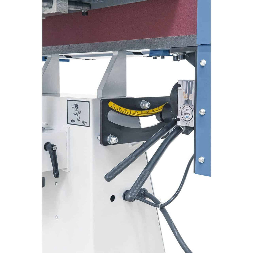 Il gruppo di levigatura è inclinabile da 90° a 45°, permettendo la lavorazione sia di bordi diritti che smussati, rendendola ideale per falegnamerie, carpenterie e officine professionali.