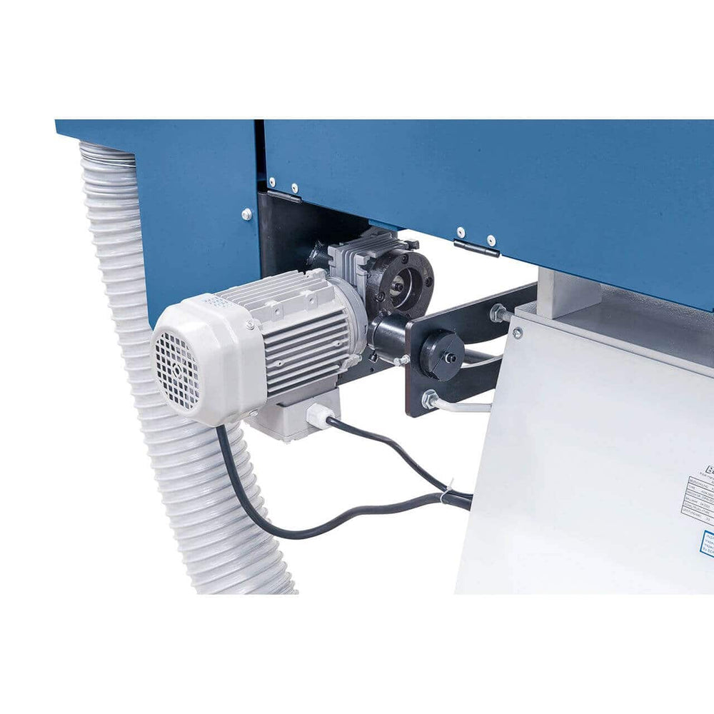 La struttura in acciaio a prova di torsione, insieme al sistema di tensionamento bilanciato a molla, elimina vibrazioni e garantisce scorrimento costante del nastro. Il piano regolabile in altezza (185 mm) assicura l’utilizzo di tutta la larghezza del nastro, mentre i doppi attacchi di aspirazione Ø 80/100 mm mantengono l’ambiente di lavoro pulito ed efficiente.