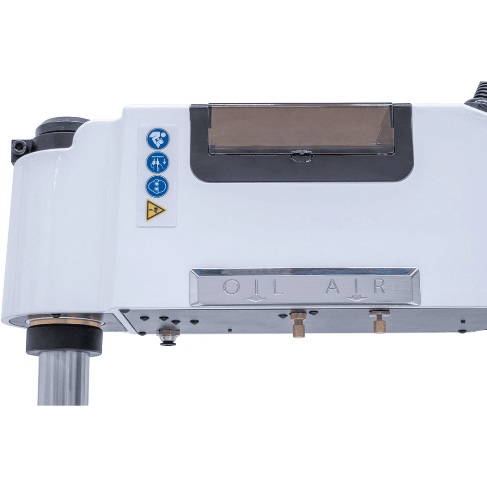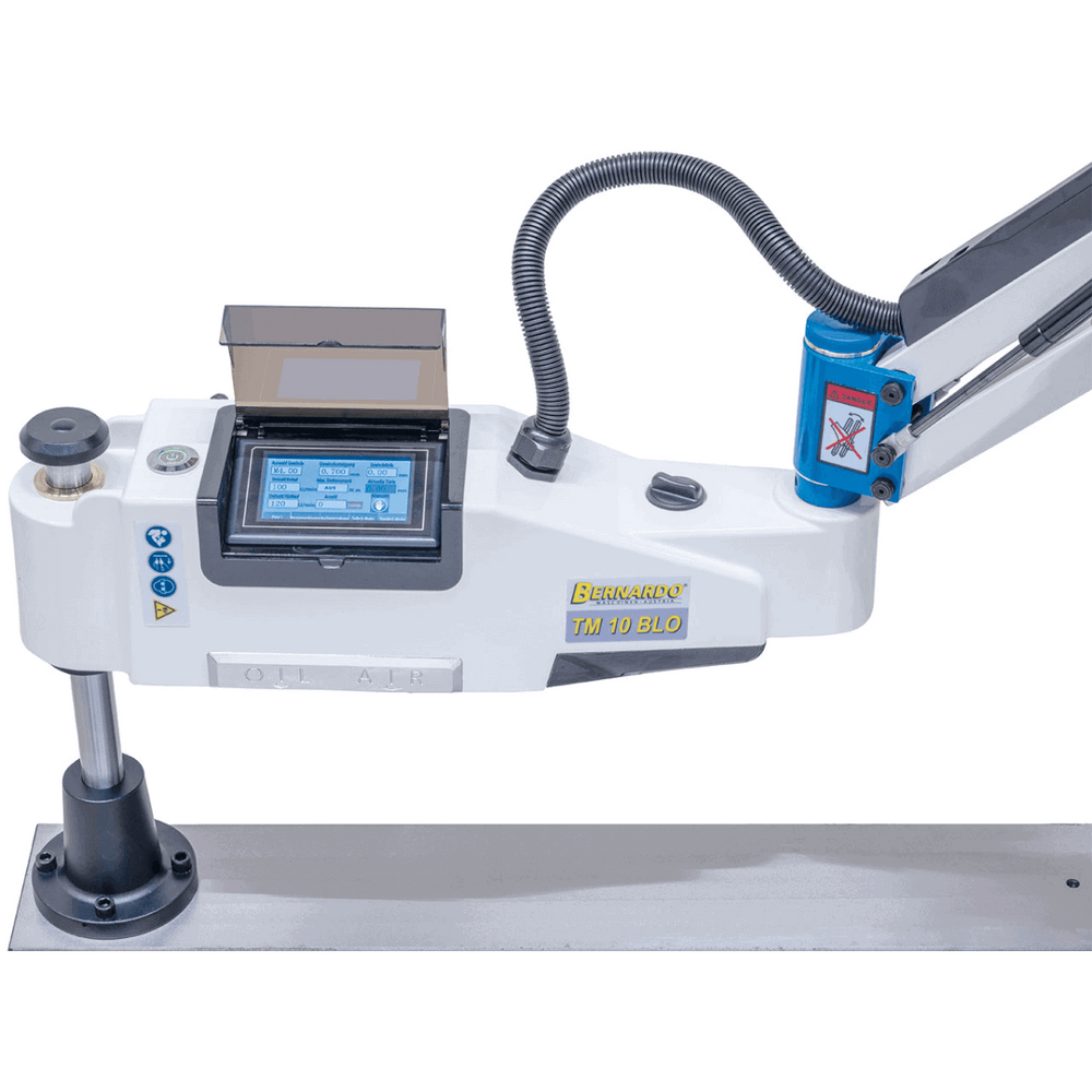 La Bernardo Filettatrice elettrica TM 10 BLO / R 1100 è una macchina compatta e precisa per filettature da M3 a M10 su acciaio, inox, alluminio e metalli non ferrosi. Garantisce alta produttività e tempi di lavorazione ridotti rispetto alla filettatura manuale, assicurando sempre un filetto perpendicolare a 90°. È dotata di sistema micro-spray per un raffreddamento costante con minimo consumo di lubrorefrigerante e di un dispositivo di soffiaggio trucioli che mantiene pulita e visibile l’area di lavoro. Il braccio snodato con raggio operativo di 1100 mm offre flessibilità operativa, mentre il motore inclinabile 0°–90° consente lavorazioni anche angolate. Il mandrino a cambio rapido con frizione di sicurezza integrata protegge i maschi da rotture accidentali. La gestione avviene tramite touchscreen con indicazione digitale della profondità. Con velocità variabile 200–1000 rpm, motore da 600 W (230 V) e peso contenuto di 21 kg, è una macchina pratica e affidabile per officine, reparti produttivi e laboratori tecnici.