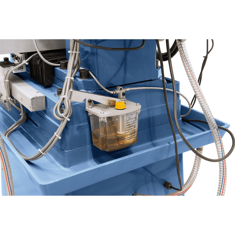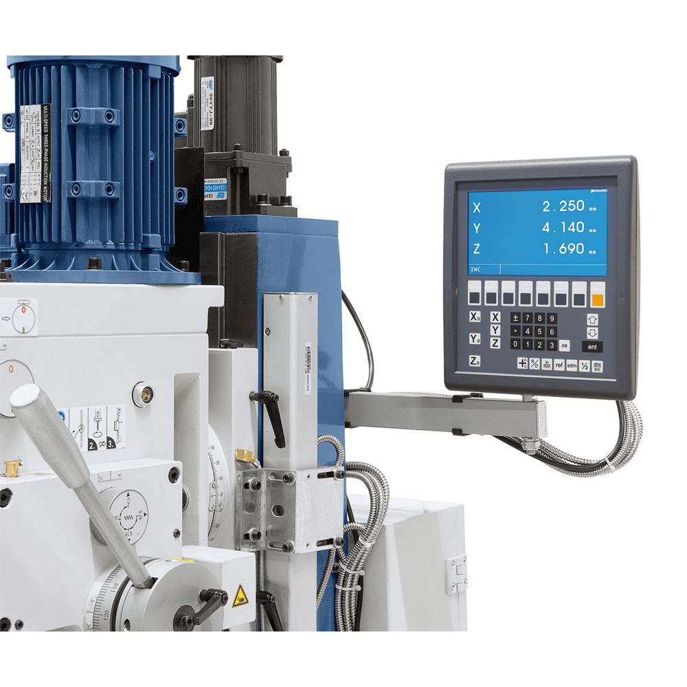 Inclusi di serie: visualizzatore digitale a 3 assi ES-12 V, pompa di refrigerazione, dispositivo di filettatura, protezione regolabile, luce LED e motore di sollevamento testa. Una macchina completa per officine e laboratori meccanici che richiedono prestazioni elevate.