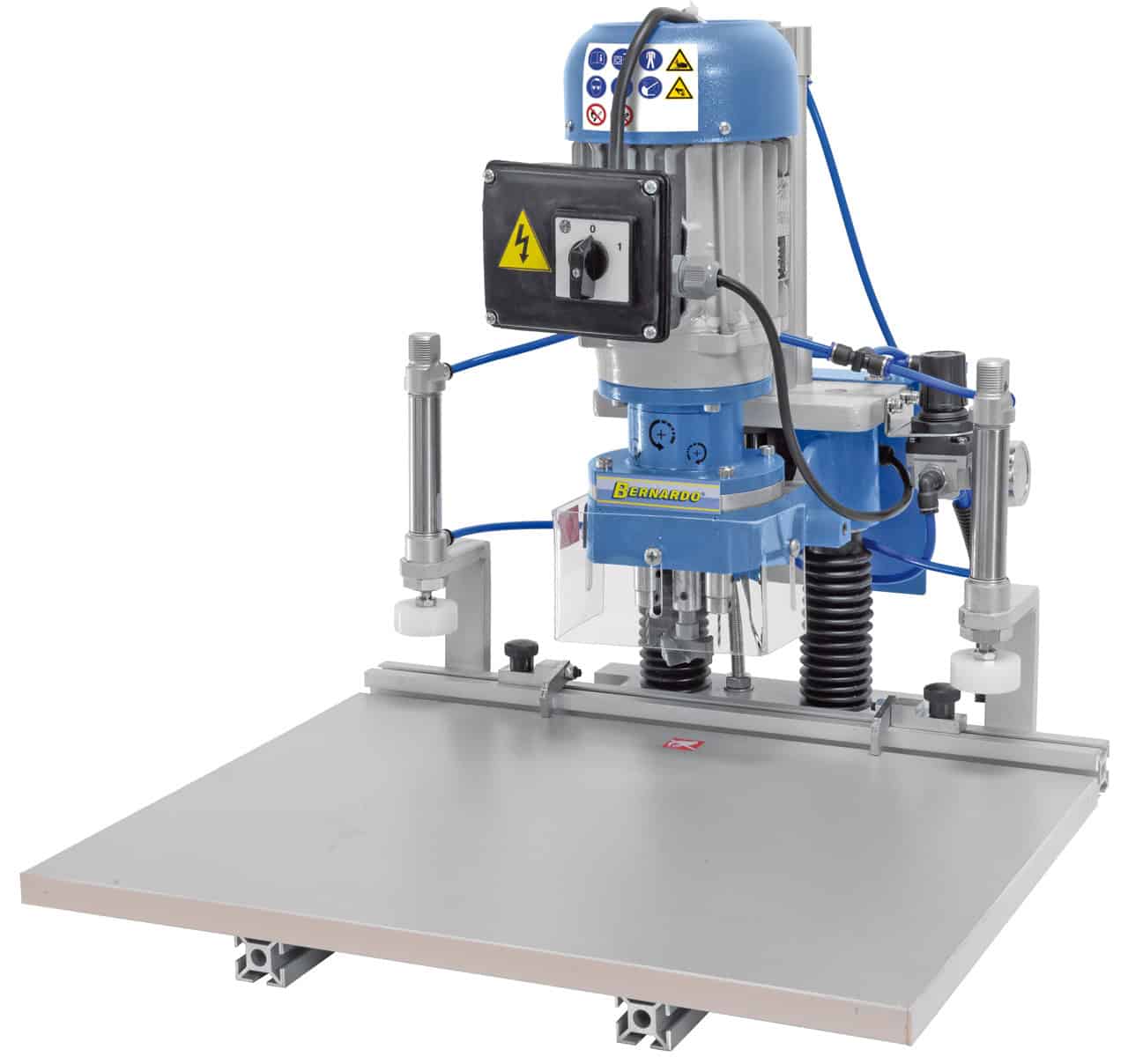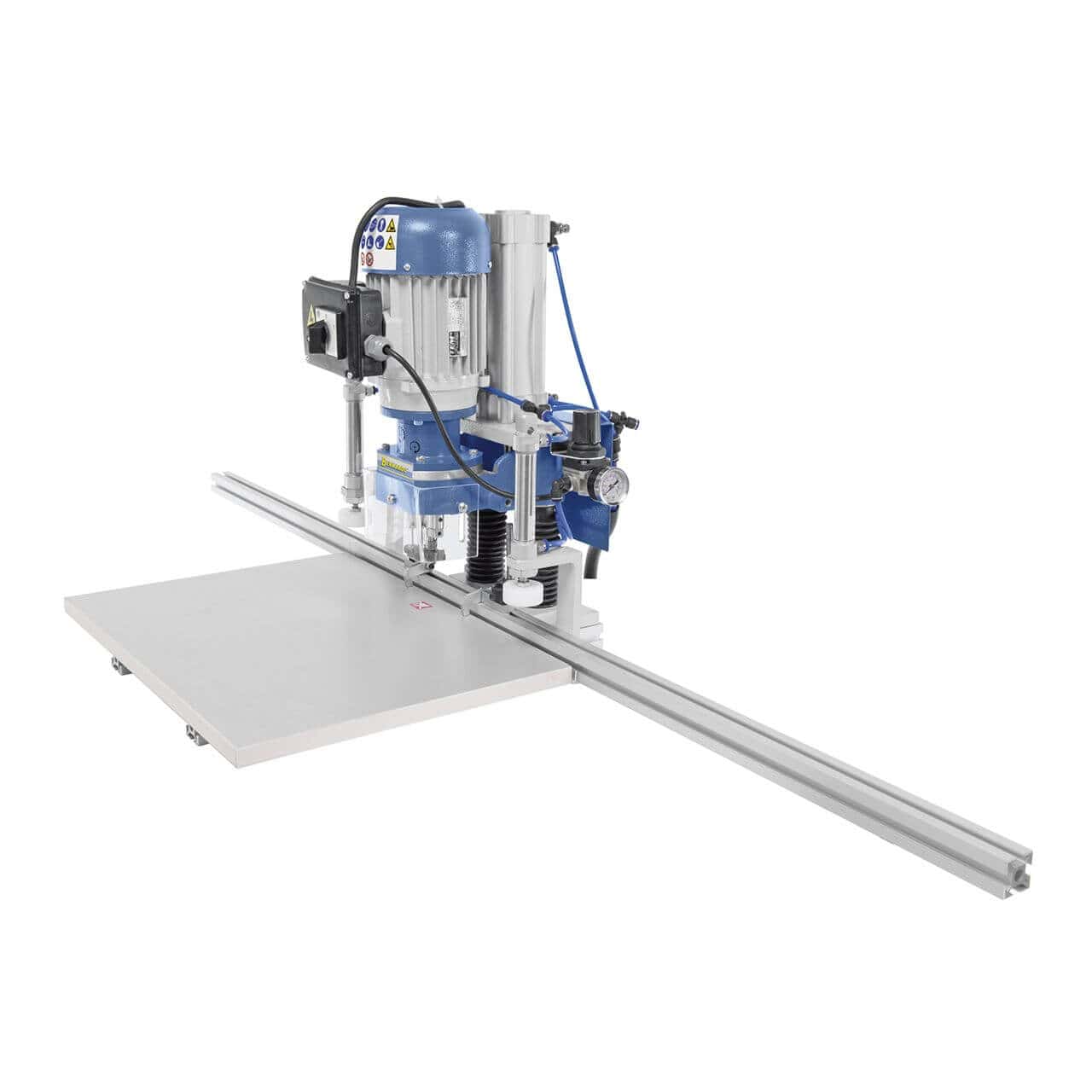 La BBM 35 P è una foratrice professionale con avanzamento pneumatico, progettata per la realizzazione precisa e veloce di fori per cerniere Grass e Blum. Ideale per falegnami e piccole aziende, consente operazioni in serie grazie alla sua guida lunga da 1,5 metri e al bloccaggio pneumatico del pezzo.