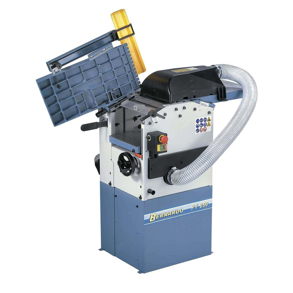 La pialla a filo e spessore Bernardo PT 260 – 400 V è una macchina combinata compatta e precisa, ideale per artigiani e hobbisti evoluti che cercano prestazioni professionali in uno spazio ridotto. Con una larghezza di piallatura di 260 mm e un motore trifase da 1,6 kW (2,1 HP), garantisce potenza e precisione in ogni lavorazione. I tavoli in alluminio rettificato assicurano planarità e scorrevolezza, mentre il tavolo a spessore guidato su quattro colonne permette una regolazione stabile e precisa. L’albero pialla con 2 coltelli HSS di alta qualità offre superfici lisce e uniformi, e la cappa di aspirazione Ø 80 mm consente una pulizia efficiente dell’area di lavoro. Con un design solido ma leggero (75 kg) e un aspiratore integrato con sacco raccolta trucioli, la PT 260 rappresenta una soluzione versatile e funzionale per officine e laboratori di falegnameria.