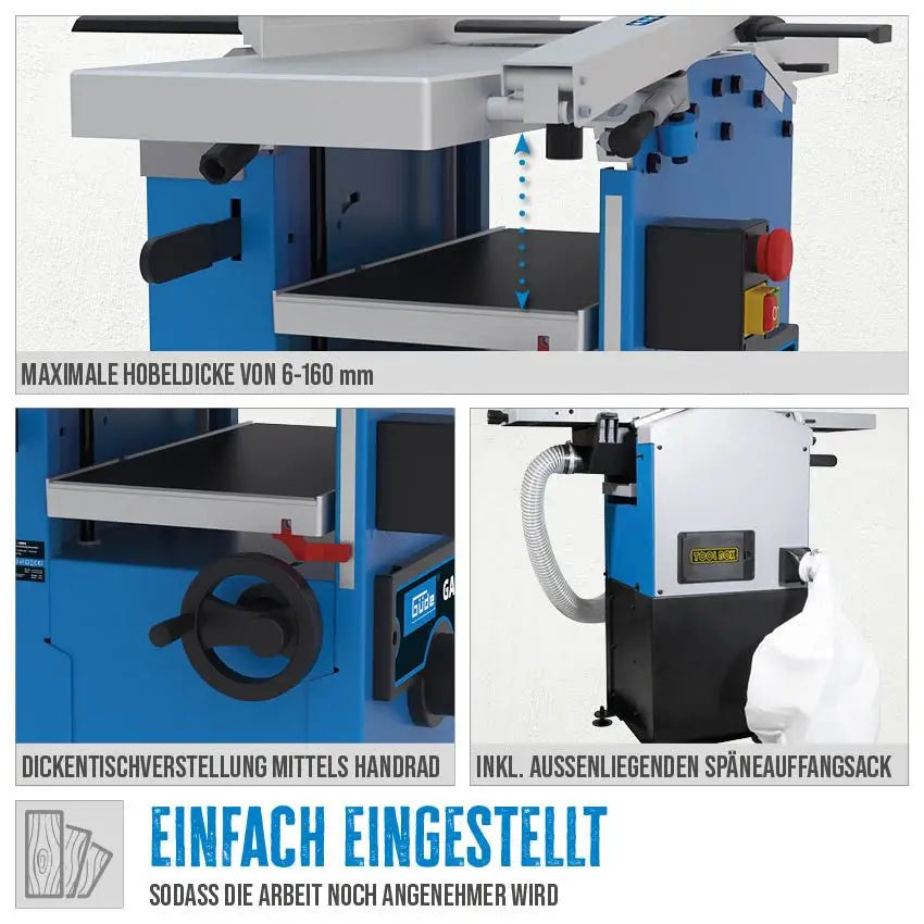 La pialla a filo e spessore Güde GADH 254 combina precisione, potenza e praticità in un unico strumento. Dotata di tavoli di piallatura in alluminio pressofuso con scanalature longitudinali, garantisce superfici perfettamente piallate e uniformi. Il tavolo a spessore regolabile tramite volantino (6–160 mm) consente lavorazioni precise su diversi tipi di legno.