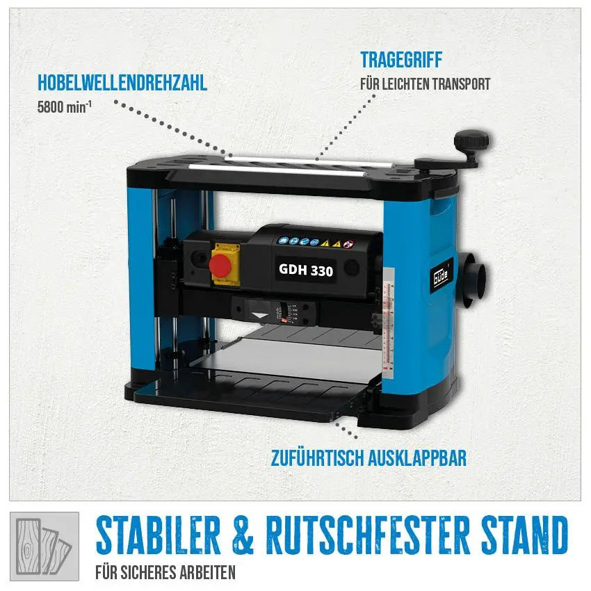 Dotata di bocchetta per aspirazione trucioli, indicatore di profondità di taglio e rulli di ritorno pezzo, la GDH 330 unisce precisione e comfort d’uso. Le maniglie integrate facilitano il trasporto, rendendola perfetta per hobbisti esigenti e artigiani professionisti.