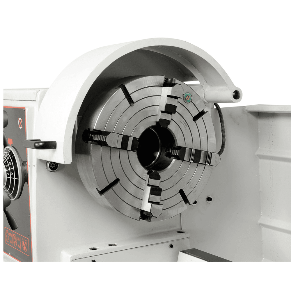 In dotazione: inverter di frequenza, mandrino 3 griffe PS3-315 mm / D8, piatto frontale Ø 500 mm, lunetta fissa (Ø max 180 mm) e mobile (Ø max 100 mm), torretta 40 posizioni con set portautensili e 4 inserti, protezione portautensile, dispositivo refrigerante, frizione di sicurezza, supporto mandrino, catena portacavi, luce LED, paraspruzzi, vassoio trucioli estraibile, pedale con freno CE.