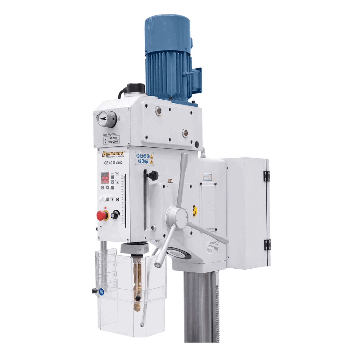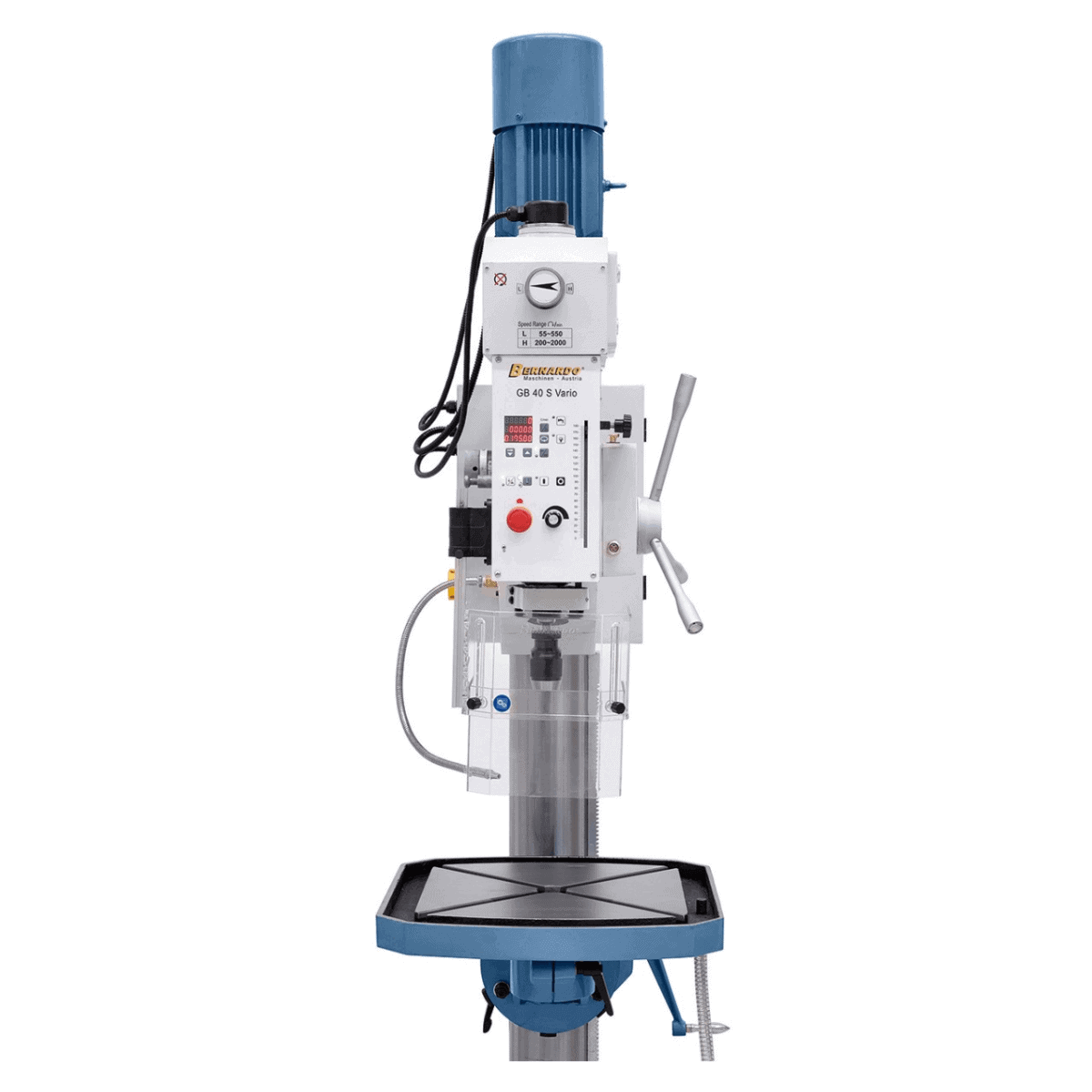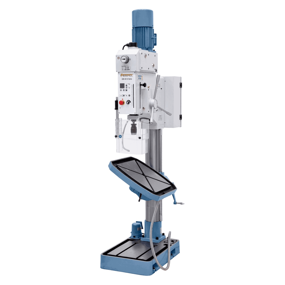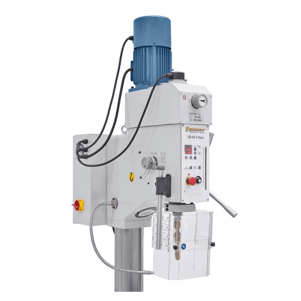 Il trapano a colonna Bernardo GB 40 S Vario è progettato per garantire prestazioni elevate e versatilità nelle lavorazioni professionali di foratura e filettatura fino a M24. Grazie alla regolazione continua della velocità (55–2000 rpm) e alla visualizzazione digitale, l’operatore può impostare facilmente la velocità di taglio ideale per ogni materiale.