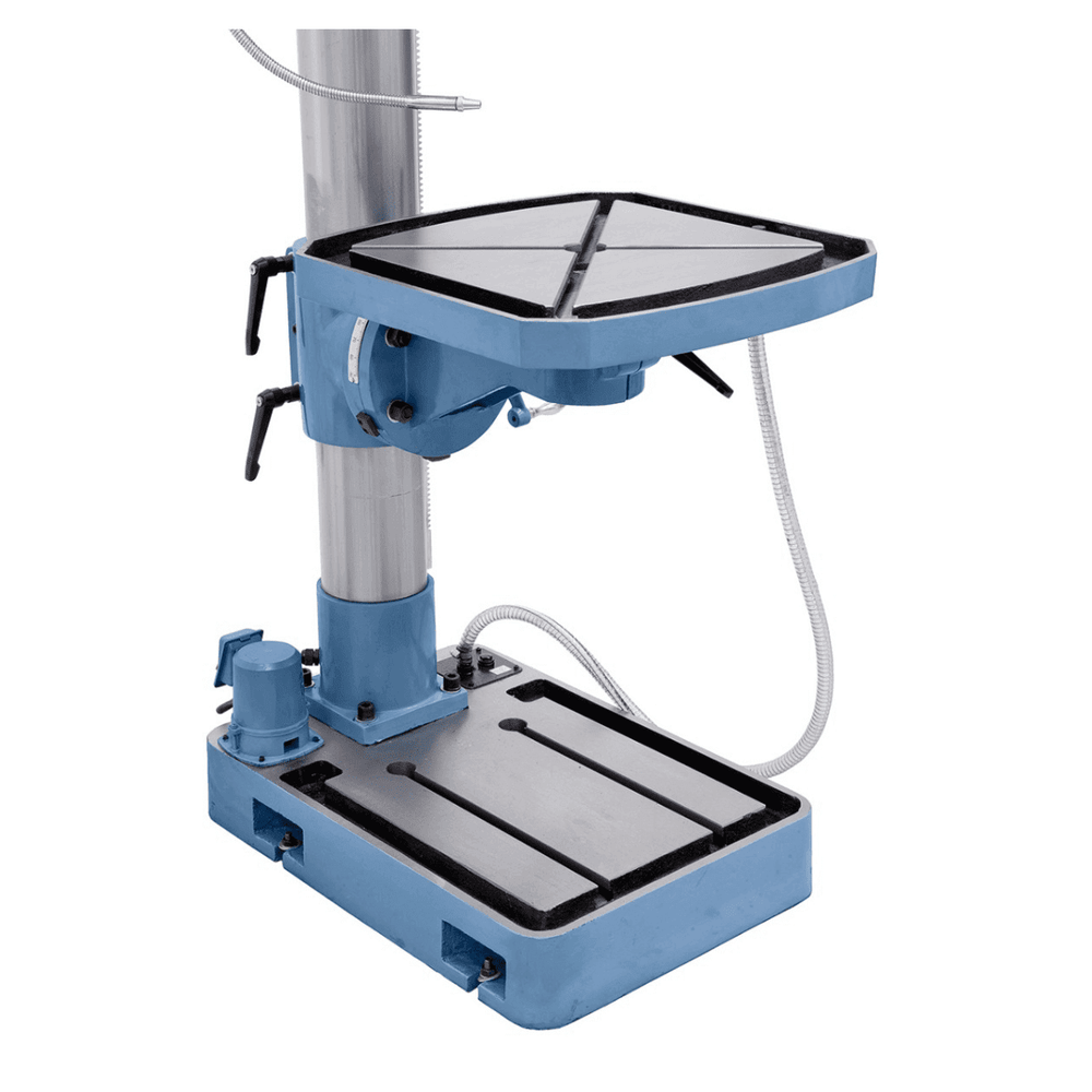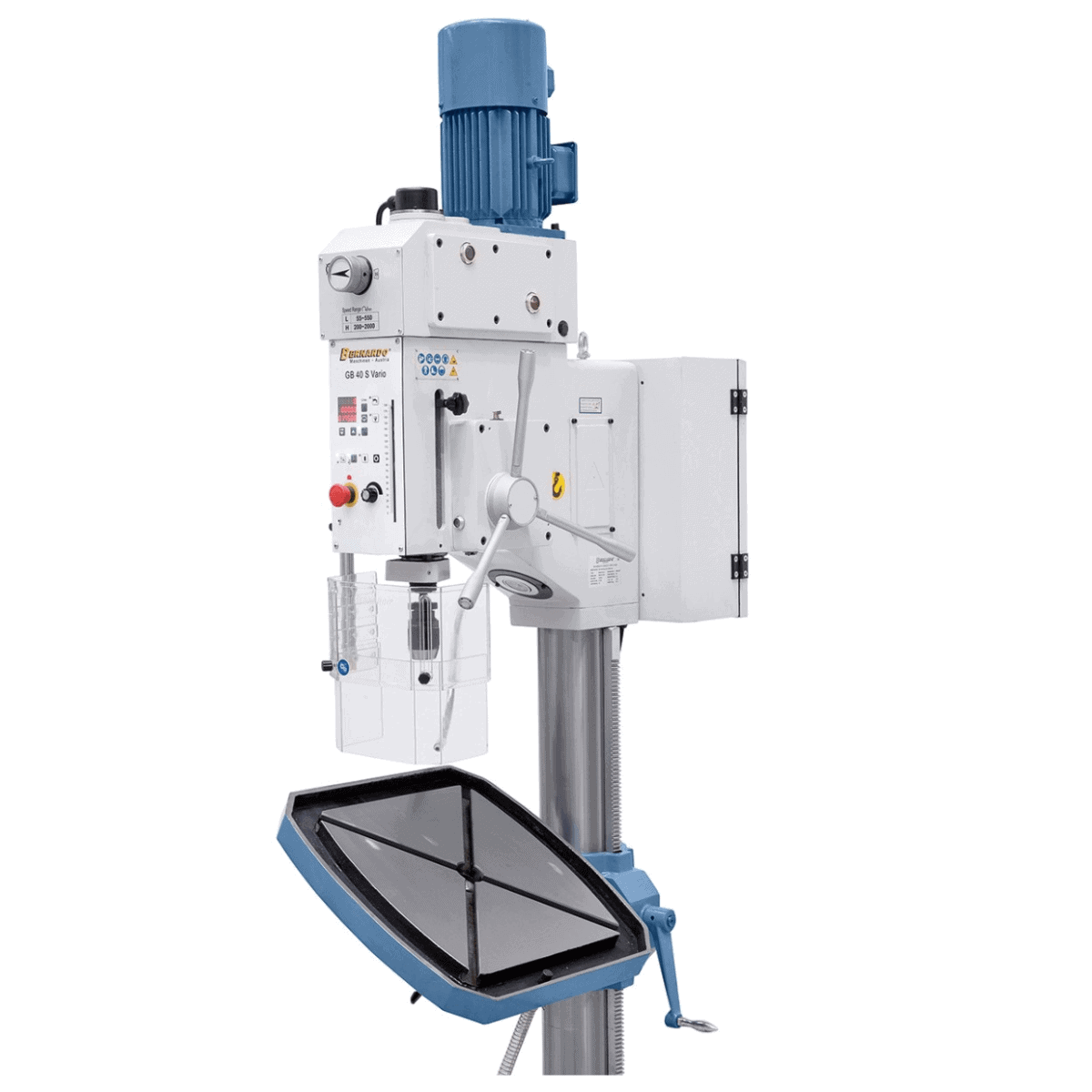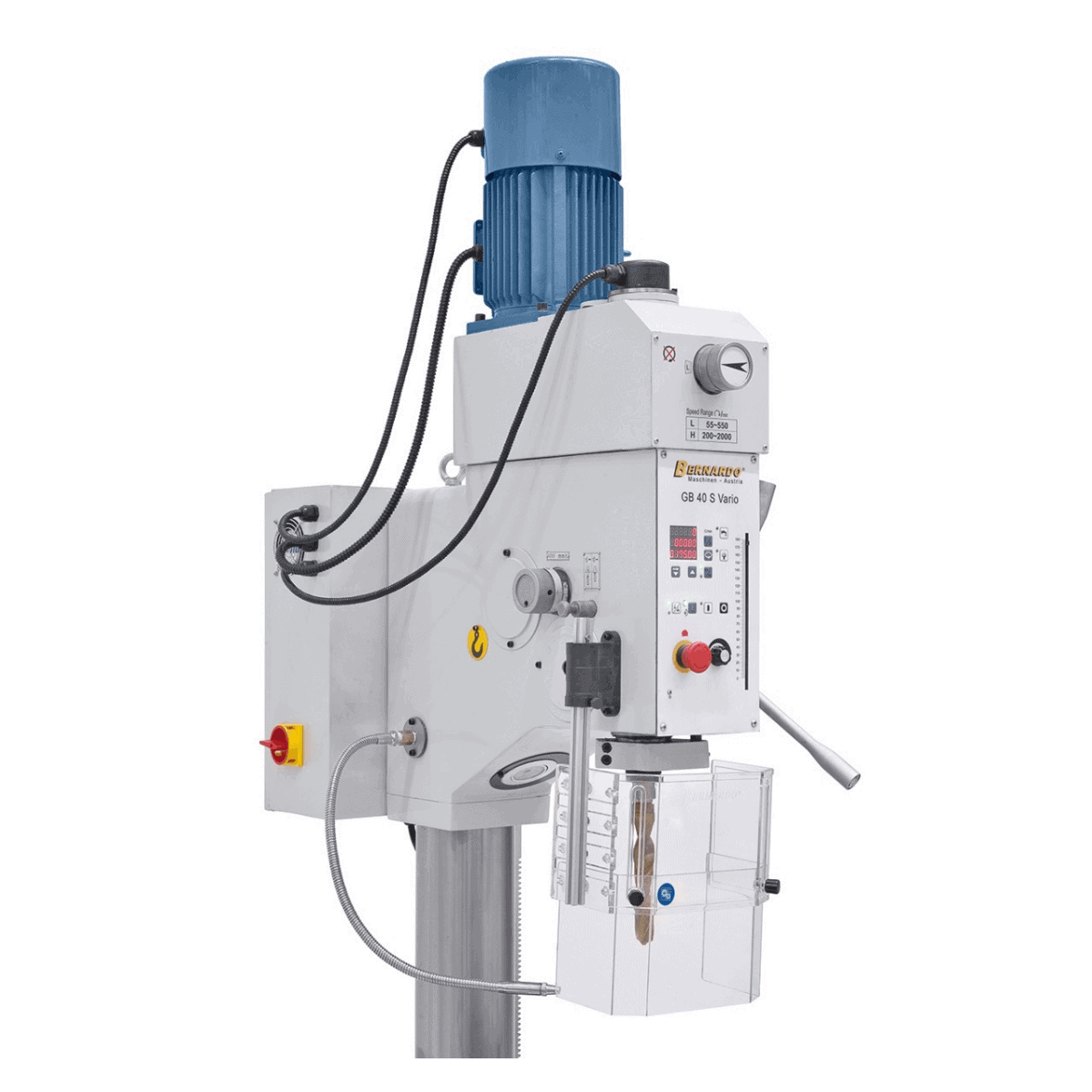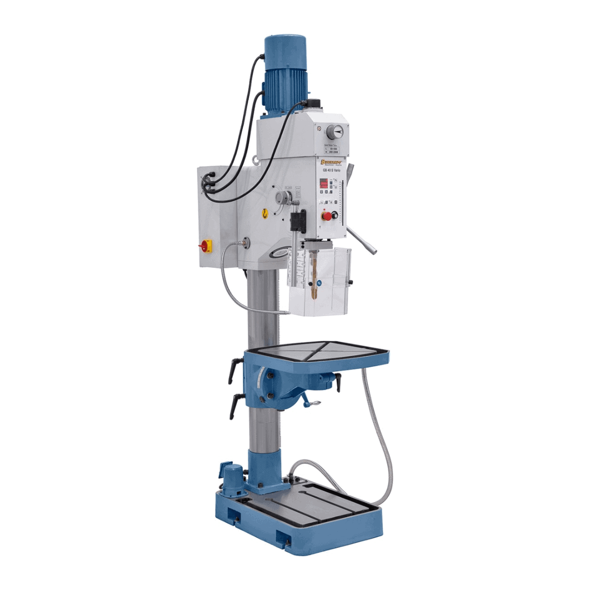 Il trapano a colonna Bernardo GB 40 S Vario è progettato per garantire prestazioni elevate e versatilità nelle lavorazioni professionali di foratura e filettatura fino a M24. Grazie alla regolazione continua della velocità (55–2000 rpm) e alla visualizzazione digitale, l’operatore può impostare facilmente la velocità di taglio ideale per ogni materiale.